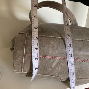 Hammitt suede tote with top handles and shoulder strap. Decorative metal studs on front. Soft, neutral taupe color. Simple, modern silhouette.
