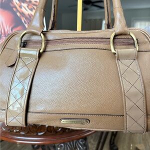 Elegant Burberry satchel in warm tan leather. Dual top handles and structured silhouette. Decorative scarf tied to one handle adds charm. Subtle gold-tone hardware and stitched detailing. Versatile for daily wear or polished outings. Corner rub and scratches on body. No major rips or tears. See photos