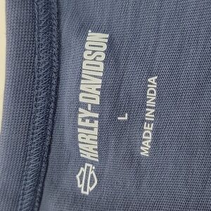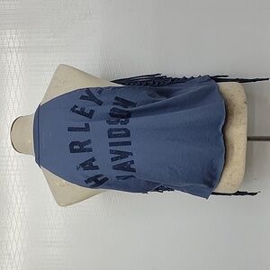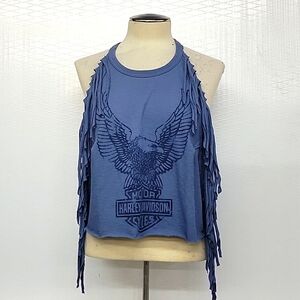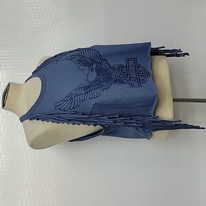 Harley-Davidson blue sleeveless tank with fringe detailing. Features bold eagle graphic and classic Harley-Davidson logo. Soft, casual style perfect for layering or warm-weather wear.