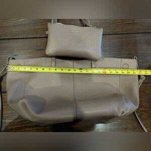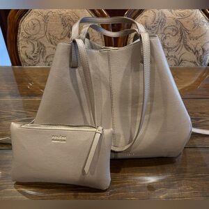 A spacious structured tote with a textured finish. It has dual top handles, two longer two short. Clean lines and minimal hardware for a modern look. The neutral taupe shade pairs well with many outfits and it's currently trending for Spring! Offers welcome!