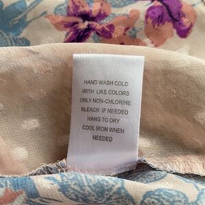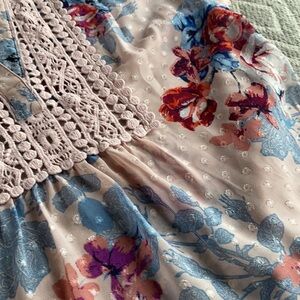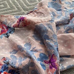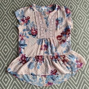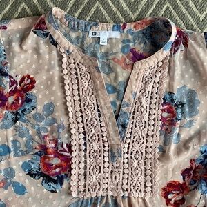 DR2 Daniel Rain Floral Peplum Top Bib lace front, open v neck, cap sleeves, camisole underneath. Meant to be slightly loose fitting. Color is more of a blush pink. Good used condition