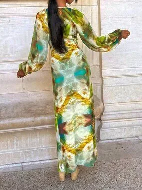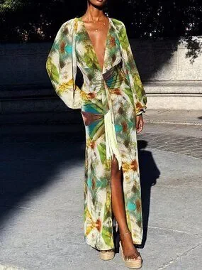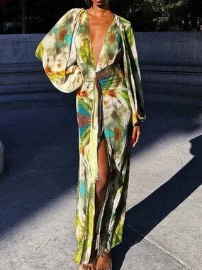 A vibrant green maxi dress features a daring deep V‑neck and a relaxed, loose fit that drapes beautifully from the high waist to a flowing slit hem. Playful tassel detailing adds movement, while long kimono‑style sleeves provide an elegant, breezy silhouette. The high‑waist cut accentuates the figure, and the maxi length ensures a graceful, floor‑skimming look perfect for evening events or stylish daytime outings.