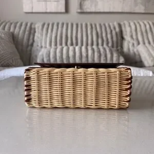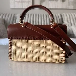 Keywords: Wicker, Rattan, Straw, Summer, Vacation, Coastal, Preppy, Cottagecore, Boho, Structured, Crossbody, Satchel, Leather, Whipstitch, Minimalist