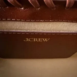 J.Crew structured satchel blends classic leather craftsmanship with a natural wicker weave for a sophisticated, summery look. This versatile bag features a rich brown leather top flap, handle, and adjustable crossbody strap, all accented by elegant gold-tone hardware. The whipstitch leather detailing along the edges adds a handcrafted touch to the boxy silhouette. Inside, you'll find a clean, lined interior with a dedicated slip pocket for organization. Perfect for transition from a garden party to a weekend brunch.