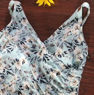Comfortable light blue floral one-piece swimsuit with a flattering v-neck and adjustable straps. Soft ruched side detail shapes the waist for a smooth silhouette. Lined for support and designed for everyday swim comfort. Available in light blue floral print.