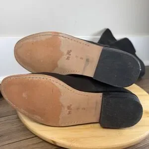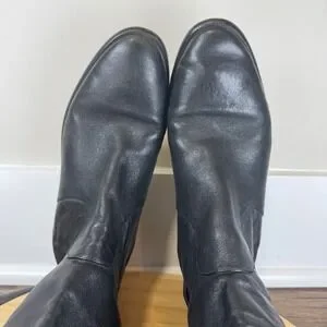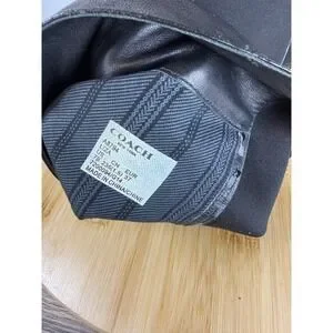 Elevate your seasonal wardrobe with these sophisticated Coach Liza tall boots, crafted from a luxurious blend of smooth black leather and flexible stretch fabric for a sleek, contoured fit. These boots feature a timeless almond toe and a practical low block heel, accented by a polished silver-tone buckle strap at the ankle and a signature logo plaque at the heel. The mixed-media construction provides both a refined aesthetic and all-day comfort, making them a versatile choice for pairing with everything from skinny jeans to midi skirts. These boots are in good pre-owned condition with some visible wear on the leather outsoles and minor creasing consistent with gentle use.
