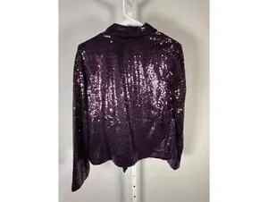 This stunning blazer features full coverage of vibrant purple sequins, providing a glamorous sparkle effect perfect for evening events or special occasions.