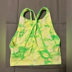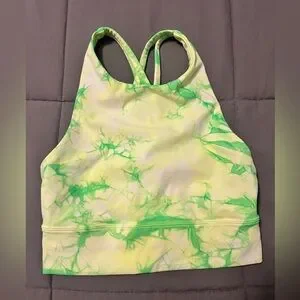 Lululemon Energy Bra High Neck Long Line Shibori in Dual Shibori White Highlight Yellow Highlight Green. Size 4. Like new w/o tags. No pads but Lululemon will provide them if you ask! Gorgeous + perfect condition.