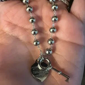 Tiffany & Co. hardware ball beaded bracelet shown with branded blue boxes, pouch, and polishing cloth. Polished metal clasp and charm detail. Ideal for gifting or layering.