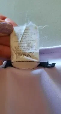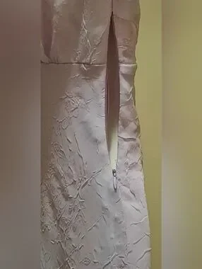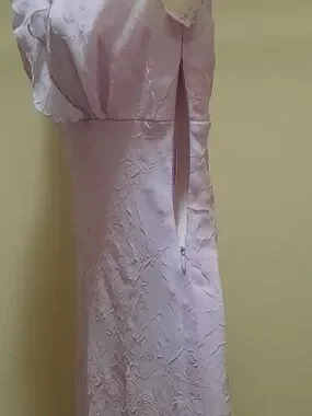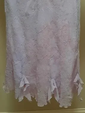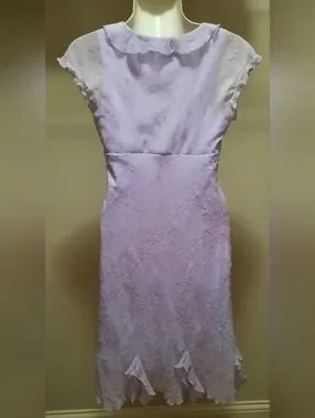 Soft lavender dress with delicate ruffle trim. Feminine V-neck and cap sleeves. Textured fabric with subtle floral detailing. Flared hem with playful petal accents. Perfect for special occasions.