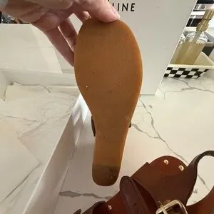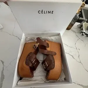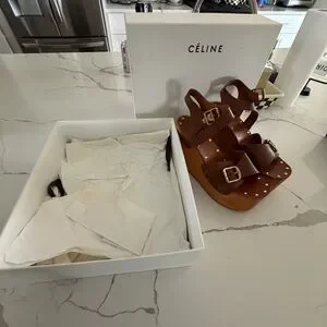 Brown leather straps with gold buckles. Studded detailing along the platform edge. Adjustable ankle strap for secure fit. Elevated wooden-look platform sole. Classic Celine branding on the box.