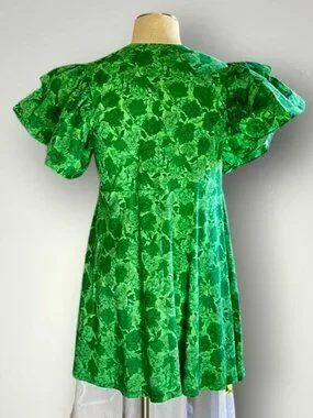 Vibrant emerald Kelly green Zara mini dress featuring an allover tonal floral print with dramatic double flutter sleeves and a softly structured A-line silhouette. Classic crew neckline, seam detail at waist, and easy pull-on fit. Made from 100% cotton and crafted in Morocco. Lightweight yet structured enough to hold its shape, this piece gives that effortless statement sleeve moment while staying wearable and breathable. Bold color, feminine volume, and clean lines make it perfect for spring events, garden parties, brunch, date nights, or even a subtle festive St. Patrick’s Day look without going novelty. Size Small. Excellent used condition or new without tags.