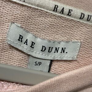 Soft pale pink knit top featuring Rae Dunn woven label. Simple crewneck styling. Clean, minimal branding detail.