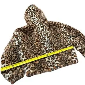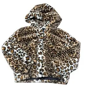 Soft faux fur hooded jacket with allover leopard print. Pullover style with elastic hem and cuffs. Plush, cozy texture for standout looks. Size Large.