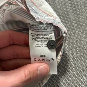 Columbia Sportswear short sleeve button-up shirts in a convenient two-pack. This set includes one green and white plaid shirt and one white shirt with horizontal stripes in grey and orange. Both shirts are crafted from 100% cotton for breathable comfort and feature a classic regular fit with a single chest pocket and a curved hem. Ideal for outdoor adventures or casual everyday wear.