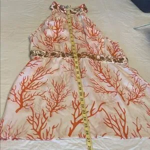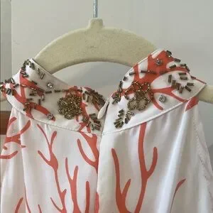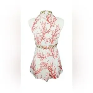 Michael Kors silk white halter top with a coral branch design and beaded accents. Features a decorative embellished neckline & waist for an upscale look. Easy-to-wear style that pairs well with jeans or skirts. Beautiful lightweight summer top for various occasions. NWOT, smoke free home. See photos for approximate measurements. Size 10.