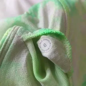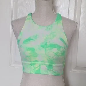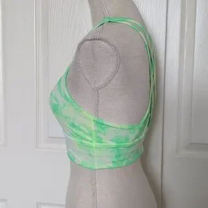 Dual Shibori White Highlight Yellow Highlight Green. Comfortable neon green tie-dye sports bralette with a high neckline and supportive underband. Soft, stretch fabric for easy movement and all-day wear. Designed for low to medium impact activities. Machine washable for easy care. Pockets for optional pads (pads not included)