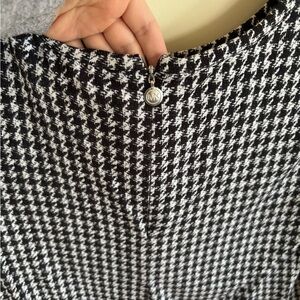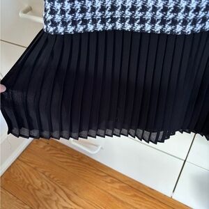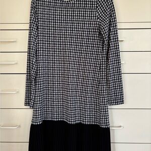 Classic black and white houndstooth dress with long sleeves. Flattering A-line silhouette with a solid black pleated hem. Versatile dress for work or events. Easy to style and comfortable to wear.