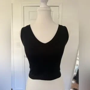 Classic black ribbed cropped tank top with a flattering V-neckline. Soft, stretchy fabric that hugs the body and is perfect for everyday wear, layering, or casual outfits.
