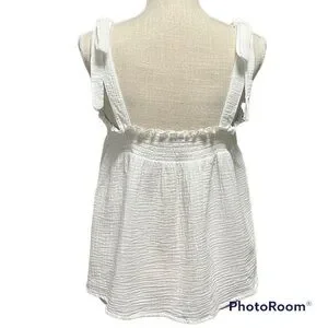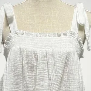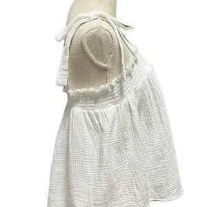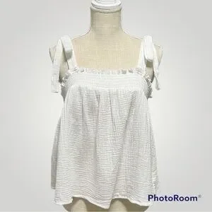 Lightweight gauze tank with adjustable tie straps. Square neckline with shirred detail. Flowy A-line silhouette. Soft, breathable fabric for warm days.