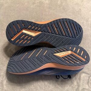 Responsive cushioned midsole for energy return. Breathable navy knit upper offers ventilation. Rose Gold accent stripe adds a pop of color. Secure lace closure for a locked-in fit.