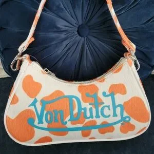 NEW Von Dutch Vegan Pony Hair Orange Cow Print Shoulder Bag with bold logo. Single top strap for easy carrying. Silver Chain and Mini Wrench. Zip closure secures contents. Great for everyday use!