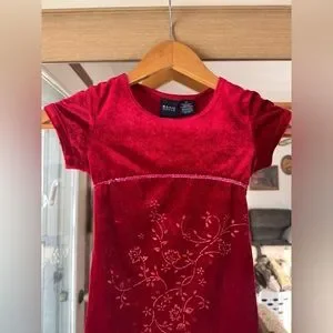 Super cute red velvet Y2K dress for Valentine’s Day! Has a pink sequin accent on the front. Size 4/5. A few small spots. Some lint on the tie. Please refer to pictures for condition.