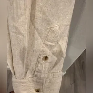 Lightweight linen-blend button-down with long sleeves. Features a single chest pocket and natural buttons. Easy neutral tone for versatile styling.