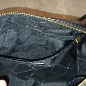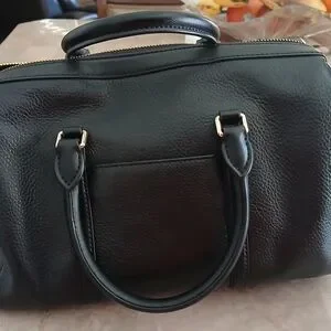 Classic Michael Kors dome satchel. Smooth black leather with gold-tone hardware. Top handles and detachable shoulder strap. MK logo charm accent. Sleek and versatile.