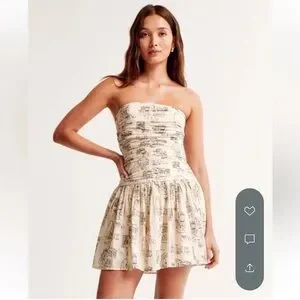 Strapless mini dress with fitted ruched bodice. Flared skirt with toile-style black print. Lightweight, breezy fabric. Elegant neutral palette for versatile styling.