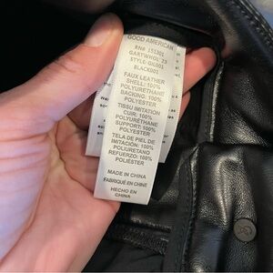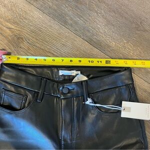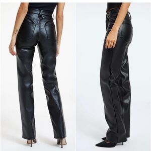 Good American branded faux leather pants. High-rise waist straight leg with smooth leather-like finish. Straight-leg cut with stitched waistband detail. Polished look for curated outfits. Slight stretch in material