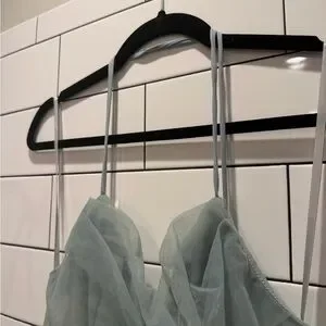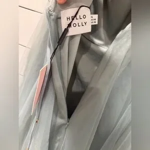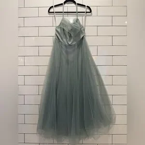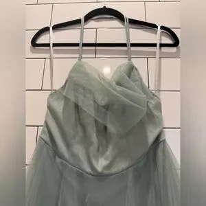 Spaghetti strap tulle gown with a soft draped bodice. Full layered skirt for elegant movement. Delicate, romantic style for formal events.