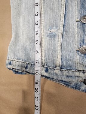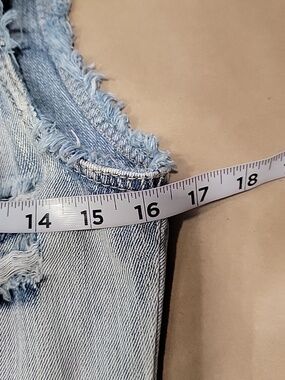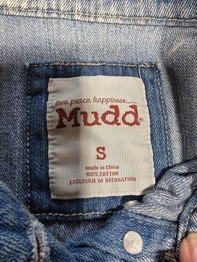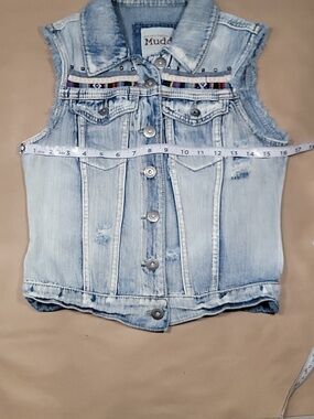 Mudd Size S Denim Distressed Blue Jean Vest, Boho, Button Front. Gently Used Condition, Factory Fading and Distressing. No Stains. Sleeveless. Button Front Closure. Collared. Multi Fabric Slices, 1 being Aztec pattern and Rivets above Chest Pockets. Please refer to measurements in photos to ensure proper fit. Shown on size 4-6 mannequin.