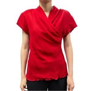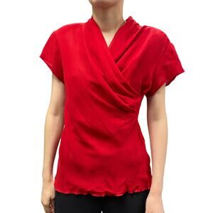 Vintage Red Faux Wrap Draped V Neck Button Back Blouse