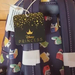 Navy Loungefly mini backpack with stacked Disney storybook appliqués. Features Tangled, The Princess and the Frog, Mulan, Pocahontas, and Aladdin book designs. Front zip pocket and gold-tone logo plate. Vibrant multicolor book graphics for collectors and Disney fans.