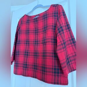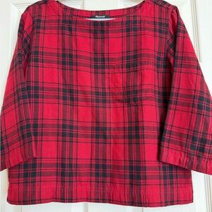 Madewell plaid tunic with a relaxed boatneck. Three-quarter sleeves and easy silhouette. Timeless plaid pattern for casual styling.