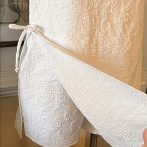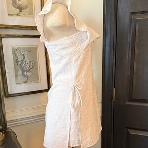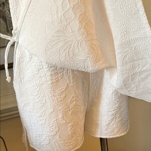 Lilly Pulitzer Zoya Romper, a white jacquard shift romper featuring a square neck with ruffled cap sleeves and side tie details. Sleeveless mini dress with romper and a ruffled square neckline. Textured jacquard fabric with subtle floral pattern. Side ties add gentle shaping. Lightweight and breezy summer style.