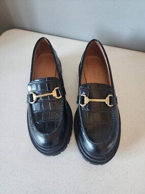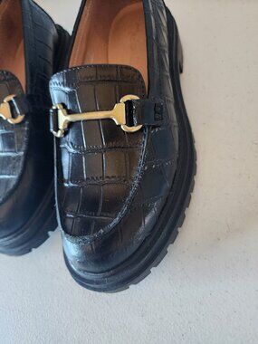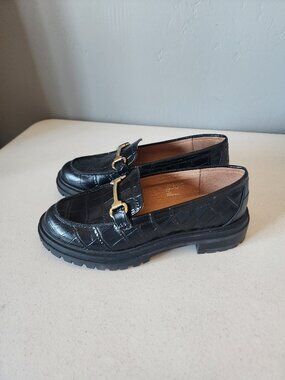 "EUC" Fantastic Black Croc Embossed Leather "The Bradley" Loafer By Madewell. Slip on Style, Leather Upper,Lining & Cushioned Foot Bed, Almond Toe with Brushed Gold-tone Horse Bit Bar Accent, Stacked 1.1/4" Heel & Rubber Lug Soles, Excellent Used Condition, No Wearing on Uppers, Minor Markings to Soles, Worn Once:) Rt.158.00 approx. Size 7, Foot Bed Measures 9.5" for Reference.