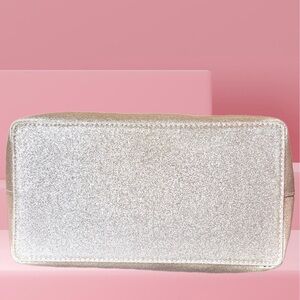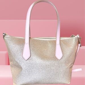 Kate Spade pink and rose gold glitter tote. Shiny gold glitter body with soft pink leather handles and trim. Includes detachable shoulder strap and decorative charm. Stylish and feminine for everyday wear.