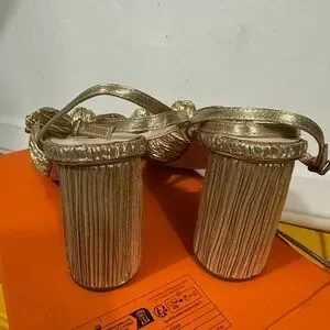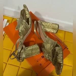 Loeffler Randall Camellia Gold Pleated Bow Heel Sandal MSRP $400 EUC Size 9.5
