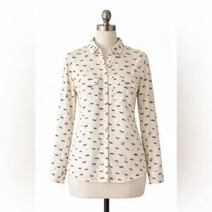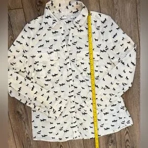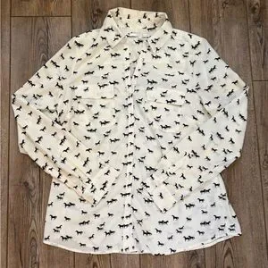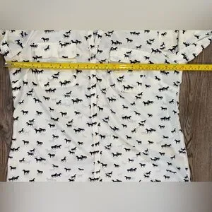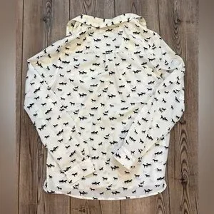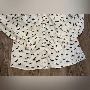 This stylish button-up shirt by Alfred Sung features a unique black horse print on a white background. Made with soft, lightweight fabric, it’s perfect for casual wear or a fun, trendy outfit. The shirt has a classic collar, button-down front, and two chest pockets for a sleek yet relaxed look. Size M, in excellent condition. Add this playful piece to your wardrobe today!