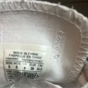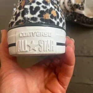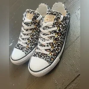 Low top Converse with bold leopard pattern. Canvas upper with white rubber toe and sole. Gold-tone eyelets and white laces. Casual, eye-catching design. New no tags