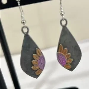These elegant earrings feature a unique gray and purple floral design, perfect for adding a touch of sophistication to any outfit.