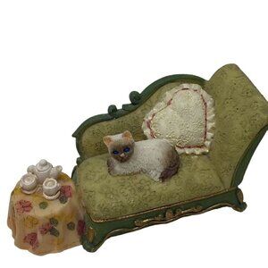 4 piece set includes bed with serving tray, nightstand, chaise with cat, and writing desk with chair