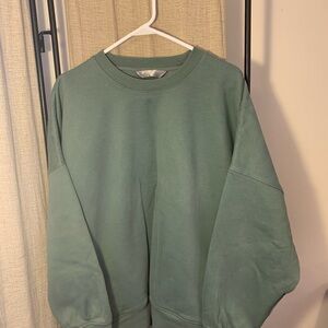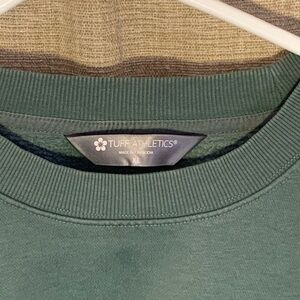Tuff Athletics crewneck with a ribbed collar. Solid green color and clean lines. Pockets on each side. Drop shoulder fit. Comfortable, everyday style. Easy to pair with casual outfits.