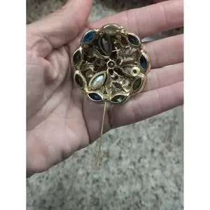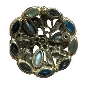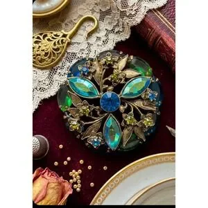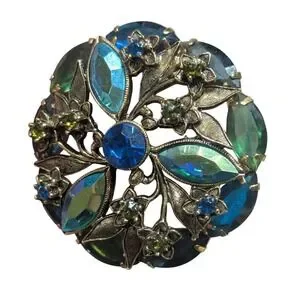 Vintage Floral Wreath Brooch Blue Green Crystal Gold Tone Botanical Pin 1.75"