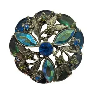 Vintage-inspired floral wreath brooch featuring a rich arrangement of emerald green and sapphire blue marquise and round-cut crystals. Intricate gold-tone metalwork creates a delicate leaf and flower motif, accented by smaller peridot-colored stones for a multi-tonal botanical look. The circular design offers a classic silhouette with a secure rollover safety clasp, making it a perfect statement piece for lapels, scarves, or hats.