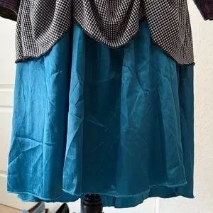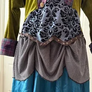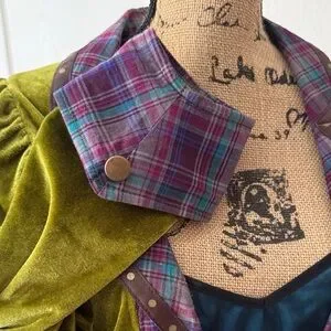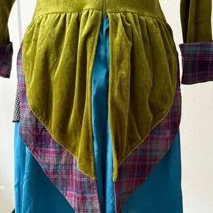 Great Halloween costume! Olive green velvet tailcoat with dramatic puff sleeves. Fitted waist and gathered peplum back. Contrasting plaid trim at cuffs and hem. Rich textured velvet finish for a vintage-inspired statement.