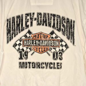 Features a large distressed back graphic “Harley-Davidson Motor Co. 1903 Motorcycles.” Front includes checkered flag patch and embroidered branding over chest pocket.