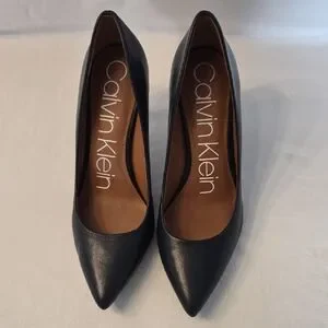 Classic pointed-toe pumps by Calvin Klein. Smooth leather upper with a streamlined profile. Padded insole for added comfort. Ideal for office or evening wear. Heel hight 3 inches.